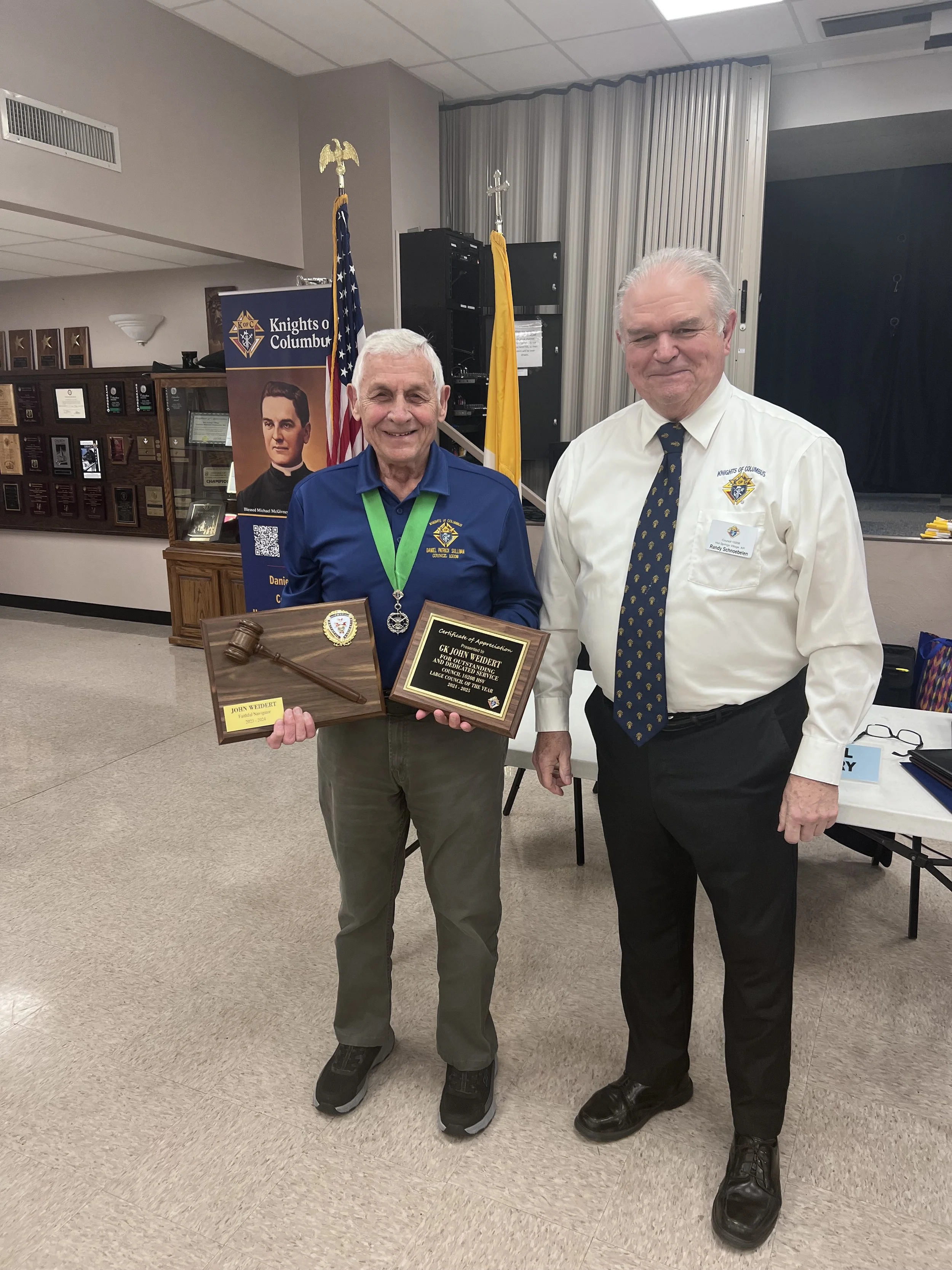 Continuing his exemplary service, Sir Knight John went on to serve as Grand Knight for the 2024–2025 Fraternal Year. Under his leadership, the council experienced a year of strong fraternal unity, effective programs, and renewed commitment to charity, faith, and service. In recognition of these accomplishments, the council was honored with the Large Council of the Year Award, a testament to his vision, hard work, and ability to inspire others. We are grateful for Sir Knight John Weidert’s dedication and congratulate him on a job exceptionally well done.